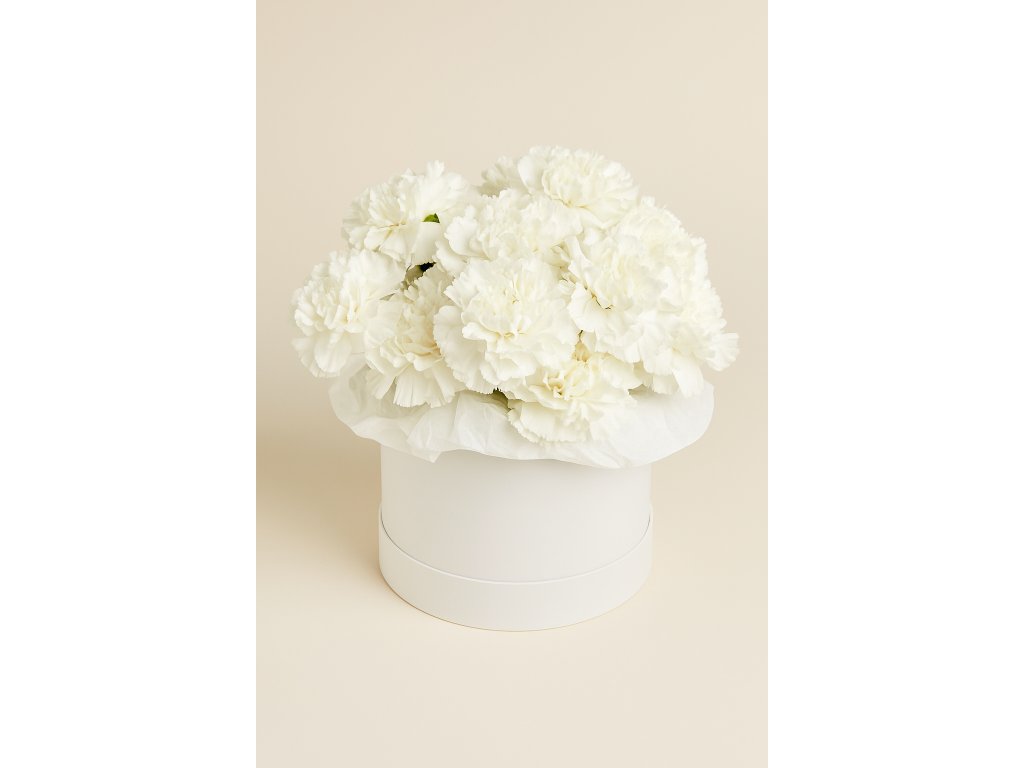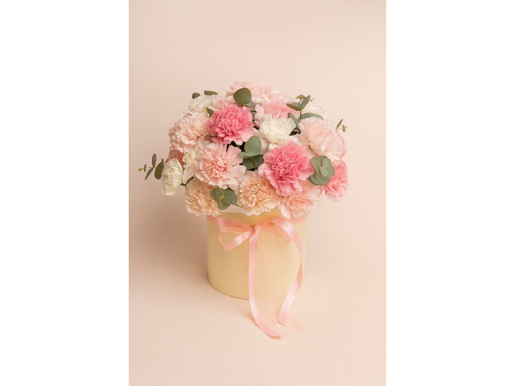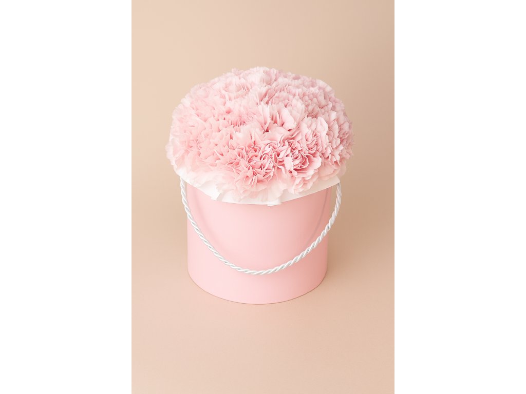UPOZORNĚNÍ: Odstín karafiátů a tvar boxu se mohou lišit podle sezóny, ale vždy garantujeme čerstvé květiny.
