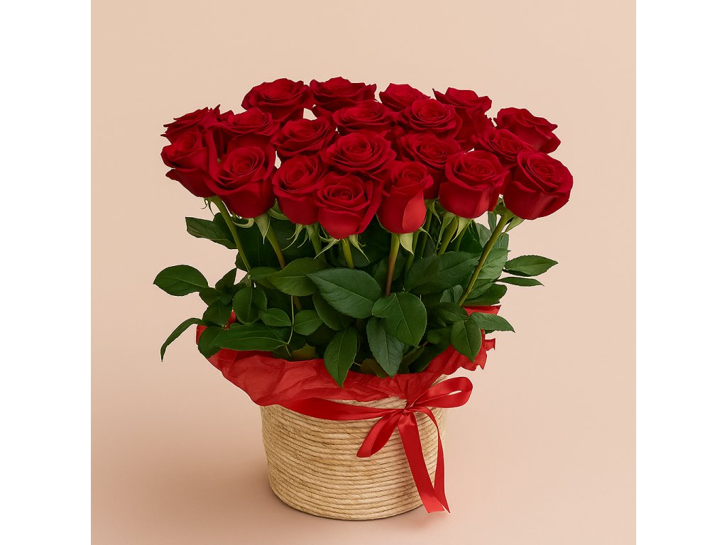 Darujte romantiku, která nezůstane bez odezvy – červené růže v koši jsou gestem, které řekne více než tisíc slov.