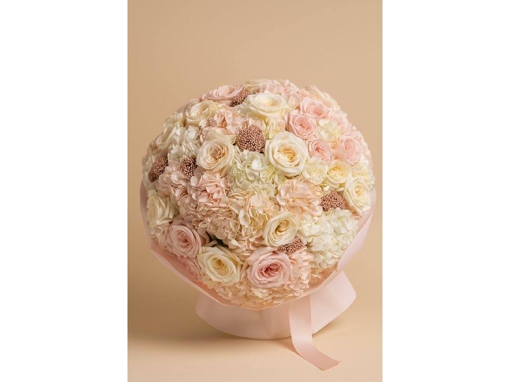 Kytice Dotek elegance je spojením jemnosti a luxusu. Velké, nadýchané květy hortenzie se dokonale doplňují s něžnými růžemi v pastelových odstínech, které dodávají celé kompozici romantický a zároveň moderní nádech. Perfektní volba pro svatby, výročí, narozeniny nebo okamžiky, kdy chcete darovat něco skutečně výjimečného.