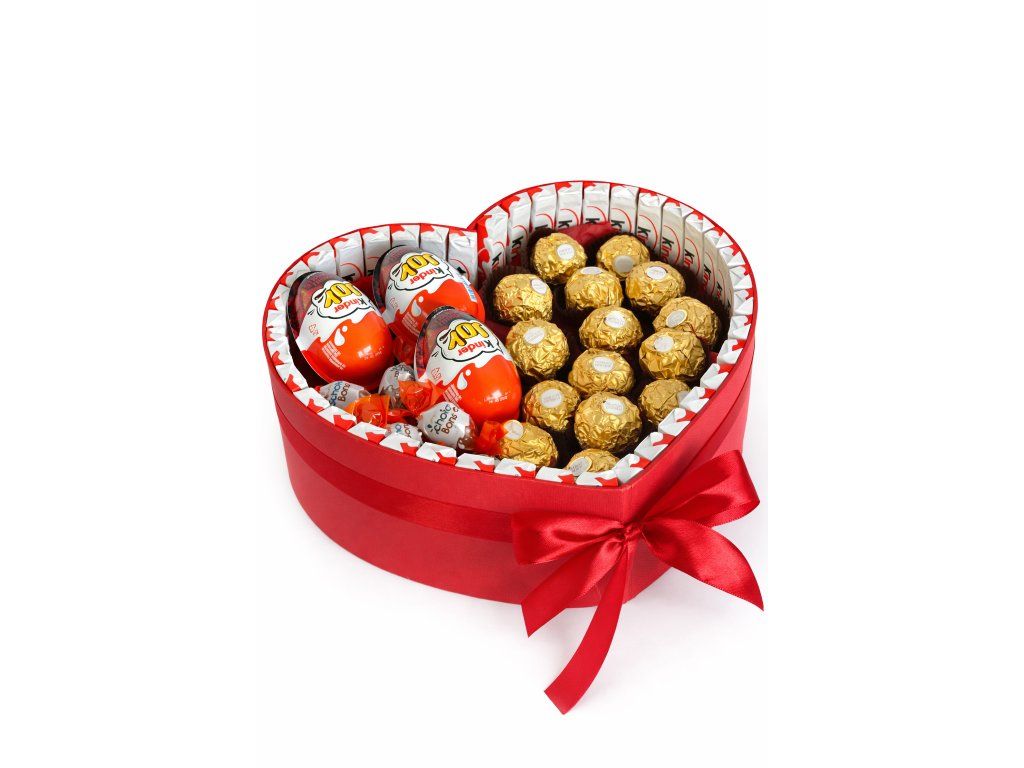 Originální dárkový box ve tvaru srdce je naplněný oblíbenými sladkostmi Kinder – čokoládovými tyčinkami, Kinder vajíčky s překvapením a lahodnými pralinkami. Celek je elegantně ozdobený červenou saténovou stuhou, díky čemuž působí luxusně a hravě zároveň. Tento sladký box potěší děti i dospělé, je ideální jako dárek k narozeninám, výročí nebo jen tak pro radost.
