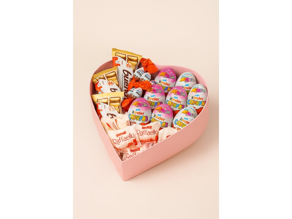 Originální dárkový box ve tvaru srdce je naplněný oblíbenými sladkostmi Kinder – čokoládovými tyčinkami, Kinder vajíčky s překvapením a lahodnými pralinkami. Celek je elegantně ozdobený červenou saténovou stuhou, díky čemuž působí luxusně a hravě zároveň. Tento sladký box potěší děti i dospělé, je ideální jako dárek k narozeninám, výročí nebo jen tak pro radost.