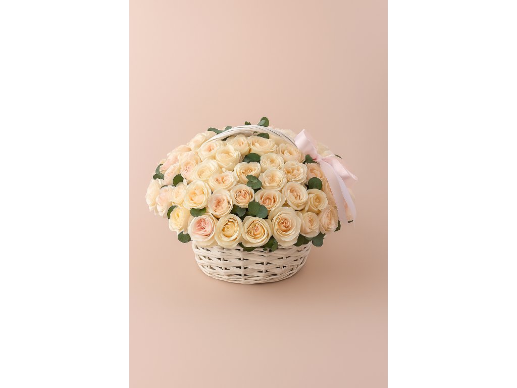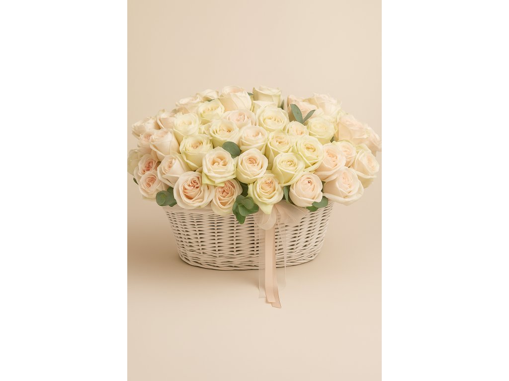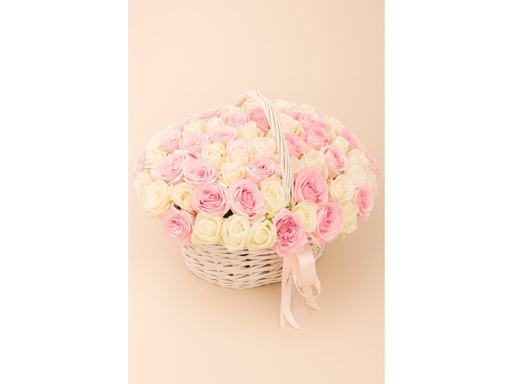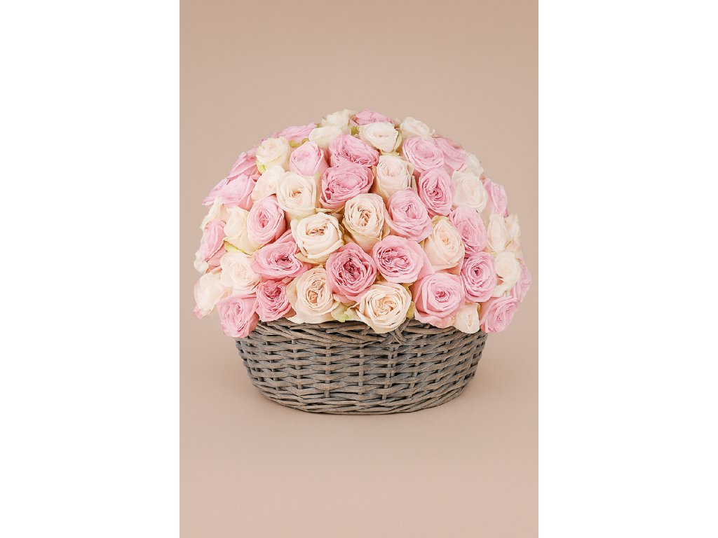 Na hlavní fotografii je zobrazen elegantní koš naplněný 75 prémiovými růžemi Pink O’Hara a White O’Hara. Tyto růže jsou známé svými velkými, nadýchanými květy s jemným pivoňkovým efektem a okouzlující, sladkou vůní. Jemné kombinace pastelově růžových a krémově bílých tónů vytvářejí romantický a luxusní dojem, který je ideální pro svatby, výročí, zásnuby nebo jako dárek pro opravdu výjimečnou osobu. Koš je doplněn dekorativními prvky a stylově laděnou mašlí, což umocňuje jeho exkluzivní vzhled.