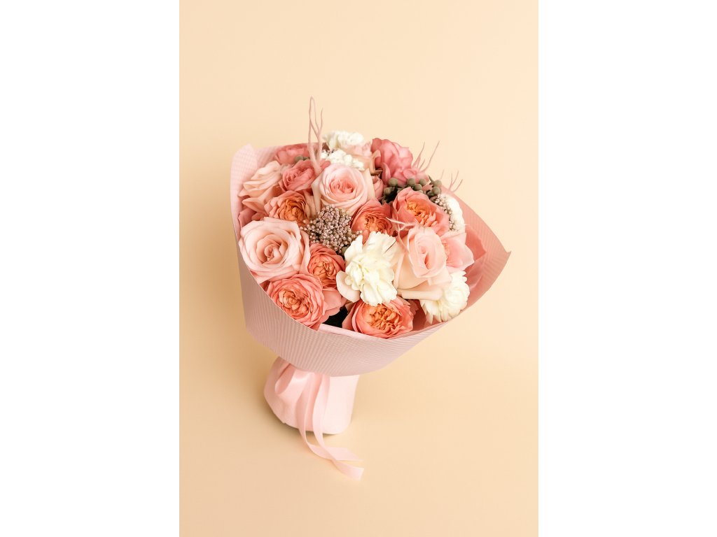 Luxusní kytice je naaranžovaná do jemných růžových, broskvových a krémových tónů a přináší dokonalou harmonii elegance a něžnosti. Obsahuje růže v několika odstínech růžové a broskvové, bílé karafiáty, jemné květy hortenzie a drobné doplňkové květiny pro bohatý a vyvážený vzhled. Vše je vkusně zabalené do růžového dekorativního papíru se saténovou stuhou. Tato kytice je ideální pro romantická překvapení, narozeniny, svatby nebo jako poděkování.
