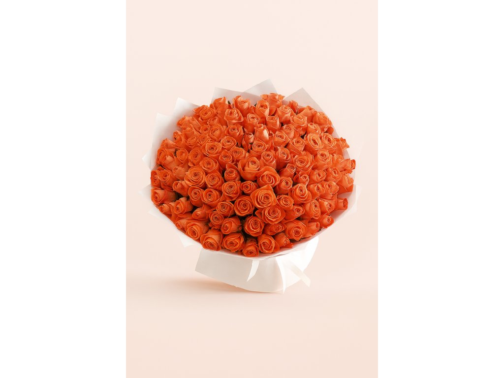 Na hlavní fotografii je zachycena nádherná kytice ze 101 korálových růží, jejichž teplý a zářivý odstín kombinuje jemnost růžové s energií oranžové. Tento jedinečný tón symbolizuje radost, obdiv a vřelost, a proto je ideální volbou pro výročí, zásnuby, oslavu narozenin nebo jako velké gesto lásky. Velký počet růží vytváří bohatý, impozantní vzhled, který okamžitě přitáhne pozornost a zanechá nezapomenutelný dojem.
