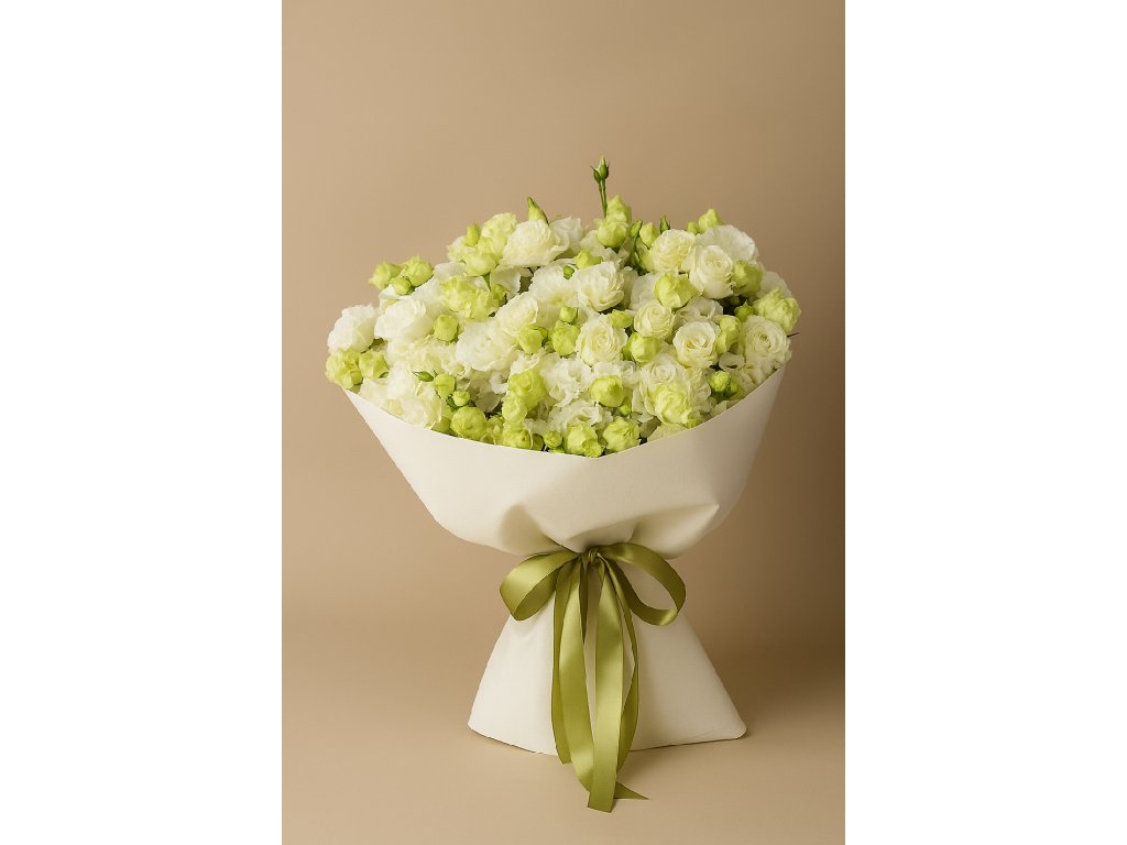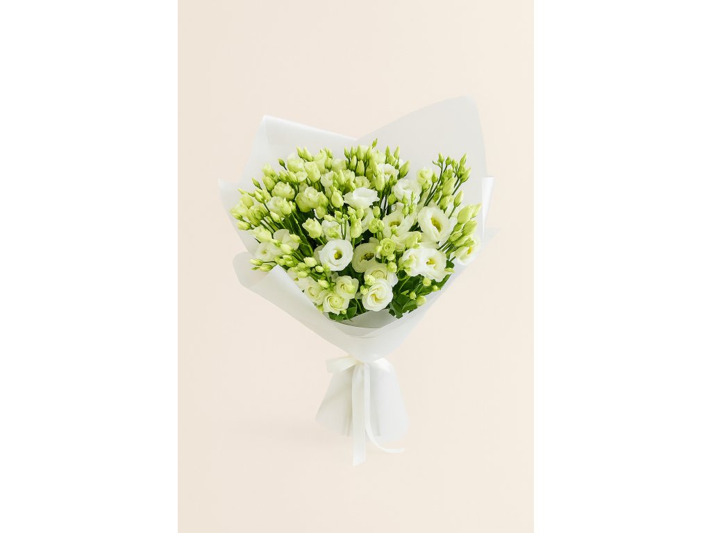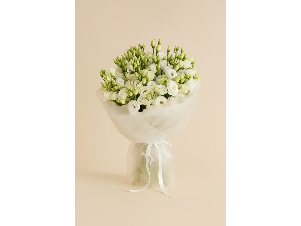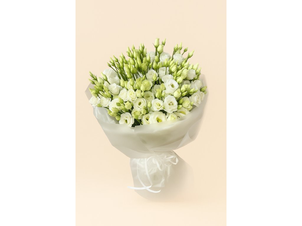 Elegantní kytice z čerstvé bílé eustomy s dlouhou výdrží až 14 dní. Jemný, čistý a slavnostní vzhled vhodný pro svatby, narozeniny, jubilea i reprezentativní dárky