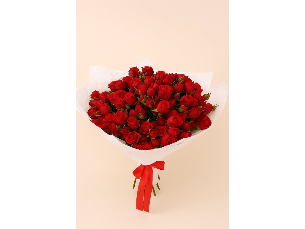 Na hlavní fotografii je zobrazena bohatá kytice z 75 červených keřových růží, které okouzlí svými drobnými, ale plnými květy a sytým odstínem červené barvy. Keřové růže jsou symbolem vášně, lásky a něžné pozornosti, přičemž jejich množství dodává aranžmá luxusní a výjimečný vzhled. Díky množství květů působí kytice objemně a slavnostně – je ideální pro významná jubilea, romantická vyznání nebo velkolepé gratulace.