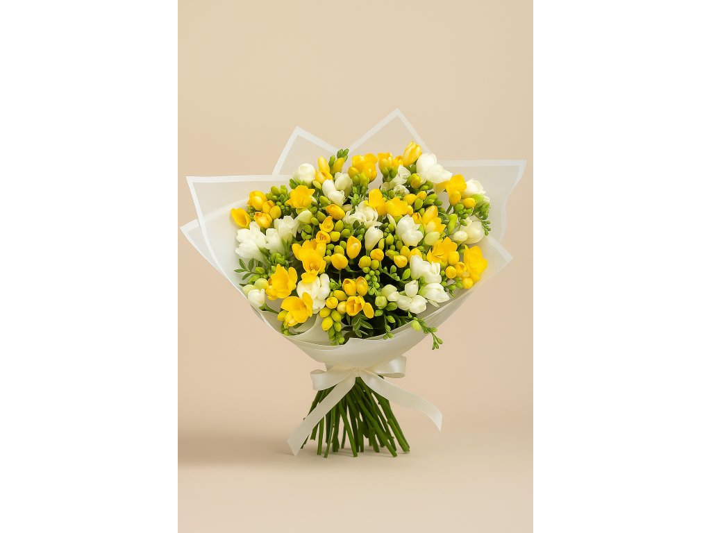 Kytice z frézií (40–50 cm) okouzlí svou jemností, elegancí a nezaměnitelnou, sladkou vůní. Frézie jsou symbolem důvěry, přátelství a nových začátků, a proto se tato kytice perfektně hodí jako dárek k narozeninám, výročí, poděkování nebo jen tak pro radost.