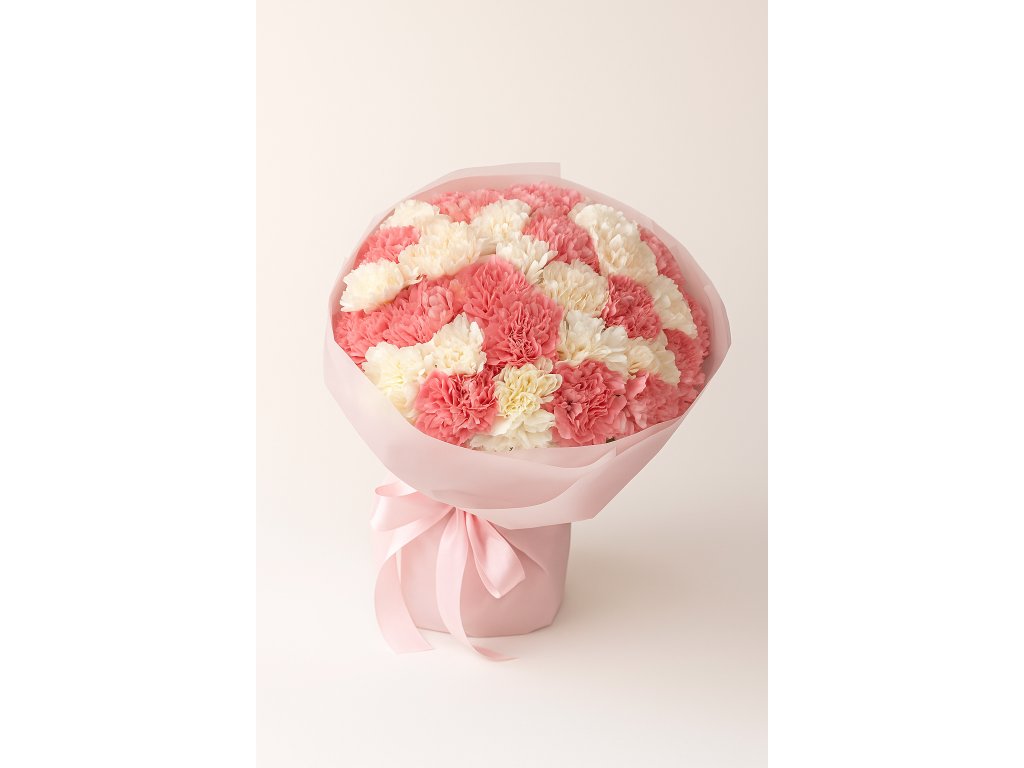Na hlavní fotografii je zachycena kytice z 33 karafiátů v jemné kombinaci růžových a bílých tónů. Toto spojení působí něžně, romanticky a zároveň svěže. Karafiáty se pyšní bohatými květy s jemně zvlněnými okvětními lístky, které dodávají kytici elegantní objem.