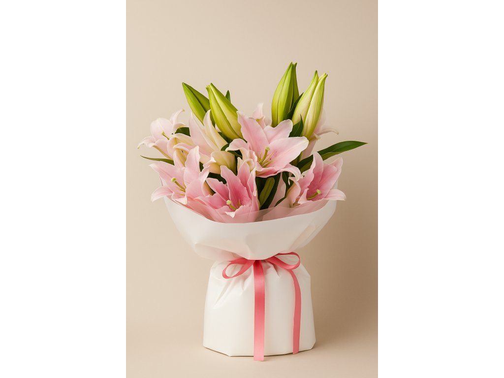 Růžová lilie je symbolem čistoty, obdivu a lásky, často také spojená s přáním štěstí a úspěchu. Díky svému majestátnímu vzhledu se tato kytice hodí pro svatby, výročí, gratulace k významným životním událostem nebo jako luxusní dárek.