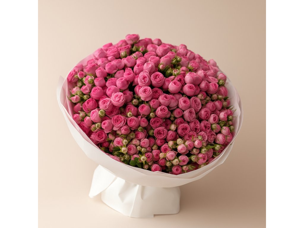 Na hlavní fotografii je zachycena kytice z 10 trsových růží odrůdy Gisella, známé svými drobnými, hustými květy v jemném růžovo-bílém odstínu. Každý stonek nese několik půvabných poupátek, což vytváří bohatý a romantický vzhled celé kytice.