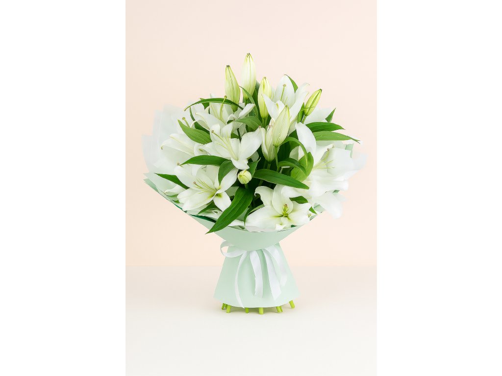Objevte půvabnou kytici bílých lilií, která ztělesňuje čistotu, eleganci a nadčasový styl. Každý stonek je pečlivě vybírán našimi floristy a ručně vázán do sofistikovaného svazku, jenž potěší pohledem i vůní. Květiny jsou zabaleny do krémově bílého floristického papíru a převázány saténovou stuhou v tlumené olivové barvě, takže kytice působí luxusně a zároveň jemně – ideální volba pro svatby, výročí, narozeniny, promoce i kondolence.