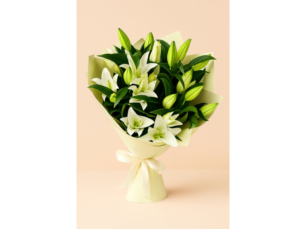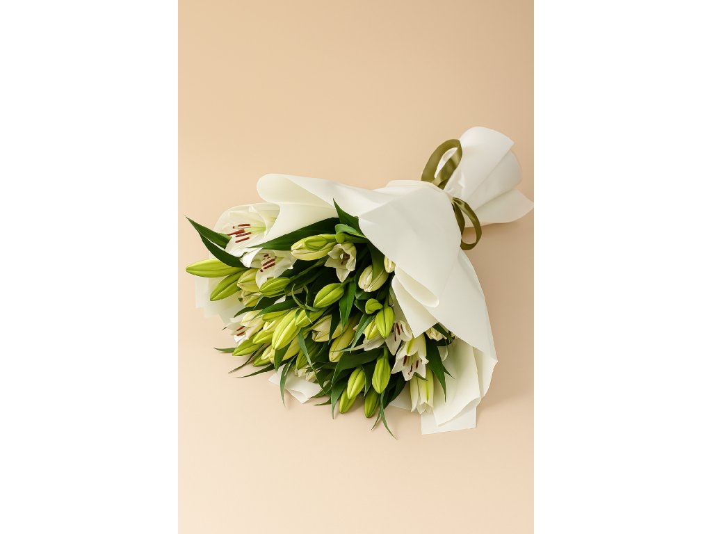 Bílá lilie patří mezi nejvyhledávanější květiny díky své nenapodobitelné vůni a vznešené kráse. Naše luxusní kytice bílých lilií je sestavena z pečlivě vybraných poupat i plně rozkvetlých květů, které společně vytvářejí harmonickou kompozici čisté bílé a svěží zeleně. Svazek je zabalen do silného krémového floristického papíru s hedvábným efektem a převázán saténovou stuhou v olivově zeleném tónu. Díky tomu kytice působí slavnostně a zároveň moderně – perfektní volba pro svatbu, křtiny, promoce, kondolenci i jako luxusní dárek z lásky.
