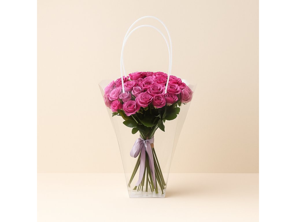 Taška je vyrobena z odolného, ale lehkého materiálu, který chrání kytici před větrem, deštěm i poškozením při přepravě. Pohodlná ucha zajišťují snadné nošení, ať už v ruce, nebo přes předloktí.